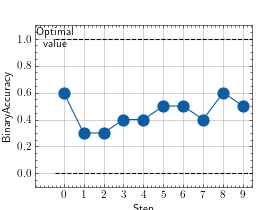 >>> from torch import rand, randint >>> # Example plotting multiple values >>> from torchmetrics.classification import BinaryAccuracy >>> metric = BinaryAccuracy() >>> values = [ ] >>> for _ in range(10): ... values.append(metric(rand(10), randint(2,(10,)))) >>> fig_, ax_ = metric.plot(values)