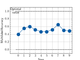 >>> from torch import rand, randint >>> # Example plotting multiple values >>> from torchmetrics.classification import MultilabelAccuracy >>> metric = MultilabelAccuracy(num_labels=3) >>> values = [ ] >>> for _ in range(10): ... values.append(metric(randint(2, (20, 3)), randint(2, (20, 3)))) >>> fig_, ax_ = metric.plot(values)