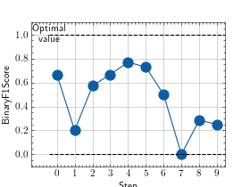 >>> from torch import rand, randint >>> # Example plotting multiple values >>> from torchmetrics.classification import BinaryF1Score >>> metric = BinaryF1Score() >>> values = [ ] >>> for _ in range(10): ... values.append(metric(rand(10), randint(2,(10,)))) >>> fig_, ax_ = metric.plot(values)