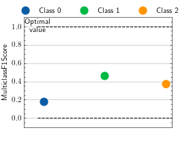 >>> from torch import randint >>> # Example plotting a single value per class >>> from torchmetrics.classification import MulticlassF1Score >>> metric = MulticlassF1Score(num_classes=3, average=None) >>> metric.update(randint(3, (20,)), randint(3, (20,))) >>> fig_, ax_ = metric.plot()