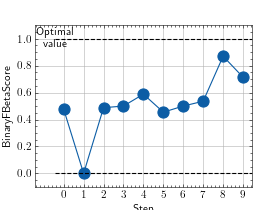 >>> from torch import rand, randint >>> # Example plotting multiple values >>> from torchmetrics.classification import BinaryFBetaScore >>> metric = BinaryFBetaScore(beta=2.0) >>> values = [ ] >>> for _ in range(10): ... values.append(metric(rand(10), randint(2,(10,)))) >>> fig_, ax_ = metric.plot(values)