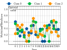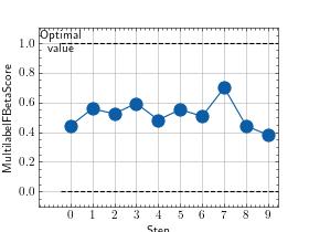 >>> from torch import rand, randint >>> # Example plotting multiple values >>> from torchmetrics.classification import MultilabelFBetaScore >>> metric = MultilabelFBetaScore(num_labels=3, beta=2.0) >>> values = [ ] >>> for _ in range(10): ... values.append(metric(randint(2, (20, 3)), randint(2, (20, 3)))) >>> fig_, ax_ = metric.plot(values)
