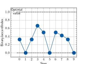 >>> # Example plotting multiple values >>> from torch import rand, randint >>> from torchmetrics.classification import BinaryJaccardIndex >>> metric = BinaryJaccardIndex() >>> values = [ ] >>> for _ in range(10): ... values.append(metric(rand(10), randint(2,(10,)))) >>> fig_, ax_ = metric.plot(values)