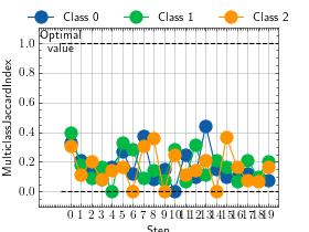 >>> # Example plotting a multiple values per class >>> from torch import randint >>> from torchmetrics.classification import MulticlassJaccardIndex >>> metric = MulticlassJaccardIndex(num_classes=3, average=None) >>> values = [] >>> for _ in range(20): ... values.append(metric(randint(3, (20,)), randint(3, (20,)))) >>> fig_, ax_ = metric.plot(values)