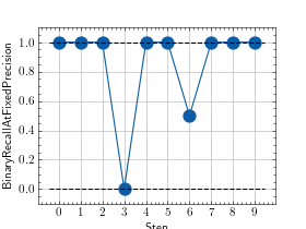 >>> from torch import rand, randint >>> # Example plotting multiple values >>> from torchmetrics.classification import BinaryRecallAtFixedPrecision >>> metric = BinaryRecallAtFixedPrecision(min_precision=0.5) >>> values = [ ] >>> for _ in range(10): ... # we index by 0 such that only the maximum recall value is plotted ... values.append(metric(rand(10), randint(2,(10,)))[0]) >>> fig_, ax_ = metric.plot(values)