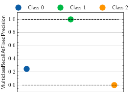 >>> from torch import rand, randint >>> # Example plotting a single value per class >>> from torchmetrics.classification import MulticlassRecallAtFixedPrecision >>> metric = MulticlassRecallAtFixedPrecision(num_classes=3, min_precision=0.5) >>> metric.update(rand(20, 3).softmax(dim=-1), randint(3, (20,))) >>> fig_, ax_ = metric.plot() # the returned plot only shows the maximum recall value by default
