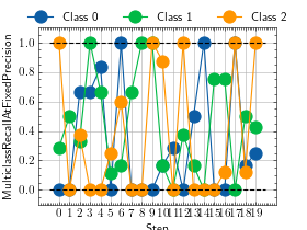 >>> from torch import rand, randint >>> # Example plotting a multiple values per class >>> from torchmetrics.classification import MulticlassRecallAtFixedPrecision >>> metric = MulticlassRecallAtFixedPrecision(num_classes=3, min_precision=0.5) >>> values = [] >>> for _ in range(20): ... # we index by 0 such that only the maximum recall value is plotted ... values.append(metric(rand(20, 3).softmax(dim=-1), randint(3, (20,)))[0]) >>> fig_, ax_ = metric.plot(values)