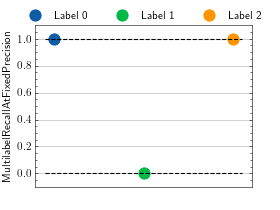 >>> from torch import rand, randint >>> # Example plotting a single value >>> from torchmetrics.classification import MultilabelRecallAtFixedPrecision >>> metric = MultilabelRecallAtFixedPrecision(num_labels=3, min_precision=0.5) >>> metric.update(rand(20, 3), randint(2, (20, 3))) >>> fig_, ax_ = metric.plot() # the returned plot only shows the maximum recall value by default