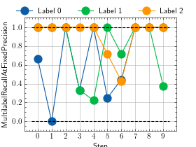 >>> from torch import rand, randint >>> # Example plotting multiple values >>> from torchmetrics.classification import MultilabelRecallAtFixedPrecision >>> metric = MultilabelRecallAtFixedPrecision(num_labels=3, min_precision=0.5) >>> values = [ ] >>> for _ in range(10): ... # we index by 0 such that only the maximum recall value is plotted ... values.append(metric(rand(20, 3), randint(2, (20, 3)))[0]) >>> fig_, ax_ = metric.plot(values)