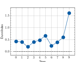 >>> # Example plotting multiple values >>> import torch >>> from torchmetrics.clustering import DunnIndex >>> metric = DunnIndex(p=2) >>> values = [ ] >>> for _ in range(10): ... values.append(metric(torch.randn(10, 3), torch.randint(0, 2, (10,)))) >>> fig_, ax_ = metric.plot(values)