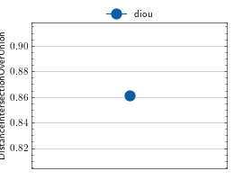 >>> # Example plotting single value >>> import torch >>> from torchmetrics.detection import DistanceIntersectionOverUnion >>> preds = [ ... { ... "boxes": torch.tensor([[296.55, 93.96, 314.97, 152.79], [298.55, 98.96, 314.97, 151.79]]), ... "scores": torch.tensor([0.236, 0.56]), ... "labels": torch.tensor([4, 5]), ... } ... ] >>> target = [ ... { ... "boxes": torch.tensor([[300.00, 100.00, 315.00, 150.00]]), ... "labels": torch.tensor([5]), ... } ... ] >>> metric = DistanceIntersectionOverUnion() >>> metric.update(preds, target) >>> fig_, ax_ = metric.plot()