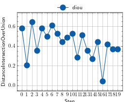 >>> # Example plotting multiple values >>> import torch >>> from torchmetrics.detection import DistanceIntersectionOverUnion >>> preds = [ ... { ... "boxes": torch.tensor([[296.55, 93.96, 314.97, 152.79], [298.55, 98.96, 314.97, 151.79]]), ... "scores": torch.tensor([0.236, 0.56]), ... "labels": torch.tensor([4, 5]), ... } ... ] >>> target = lambda : [ ... { ... "boxes": torch.tensor([[300.00, 100.00, 315.00, 150.00]]) + torch.randint(-10, 10, (1, 4)), ... "labels": torch.tensor([5]), ... } ... ] >>> metric = DistanceIntersectionOverUnion() >>> vals = [] >>> for _ in range(20): ... vals.append(metric(preds, target())) >>> fig_, ax_ = metric.plot(vals)