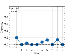 >>> # Example plotting multiple values >>> import torch >>> from torchmetrics.nominal import CramersV >>> metric = CramersV(num_classes=5) >>> values = [ ] >>> for _ in range(10): ... values.append(metric(torch.randint(0, 4, (100,)), torch.randint(0, 4, (100,)))) >>> fig_, ax_ = metric.plot(values)