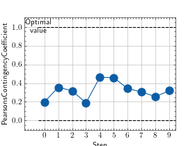 >>> # Example plotting multiple values >>> import torch >>> from torchmetrics.nominal import PearsonsContingencyCoefficient >>> metric = PearsonsContingencyCoefficient(num_classes=5) >>> values = [ ] >>> for _ in range(10): ... values.append(metric(torch.randint(0, 4, (100,)), torch.randint(0, 4, (100,)))) >>> fig_, ax_ = metric.plot(values)