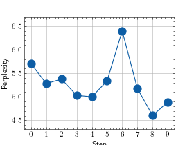>>> # Example plotting multiple values >>> import torch >>> from torchmetrics.text import Perplexity >>> metric = Perplexity() >>> values = [ ] >>> for _ in range(10): ... values.append(metric(torch.rand(2, 8, 5), torch.randint(5, (2, 8)))) >>> fig_, ax_ = metric.plot(values)