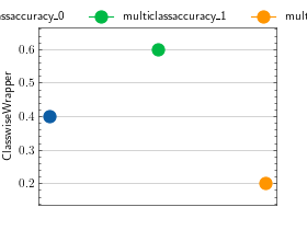 >>> from torchmetrics.wrappers import ClasswiseWrapper >>> from torchmetrics.classification import MulticlassAccuracy >>> metric = ClasswiseWrapper( ... MulticlassAccuracy(num_classes=3, average=None), ... labels=["horse", "fish", "dog"] ... ) >>> preds = torch.randn(10, 3).softmax(dim=-1) >>> target = torch.randint(3, (10,)) >>> metric(preds, target) {'multiclassaccuracy_horse': tensor(0.3333), 'multiclassaccuracy_fish': tensor(0.6667), 'multiclassaccuracy_dog': tensor(0.)}