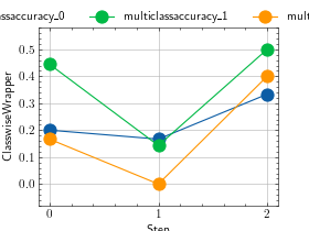 >>> # Example plotting multiple values >>> import torch >>> from torchmetrics.wrappers import ClasswiseWrapper >>> from torchmetrics.classification import MulticlassAccuracy >>> metric = ClasswiseWrapper(MulticlassAccuracy(num_classes=3, average=None)) >>> values = [ ] >>> for _ in range(3): ... values.append(metric(torch.randint(3, (20,)), torch.randint(3, (20,)))) >>> fig_, ax_ = metric.plot(values)