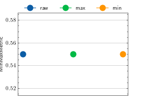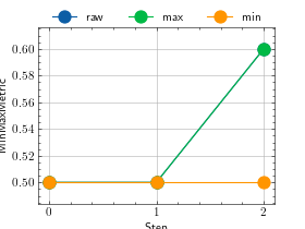 >>> # Example plotting multiple values >>> import torch >>> from torchmetrics.wrappers import MinMaxMetric >>> from torchmetrics.classification import BinaryAccuracy >>> metric = MinMaxMetric(BinaryAccuracy()) >>> values = [ ] >>> for _ in range(3): ... values.append(metric(torch.randint(2, (20,)), torch.randint(2, (20,)))) >>> fig_, ax_ = metric.plot(values)