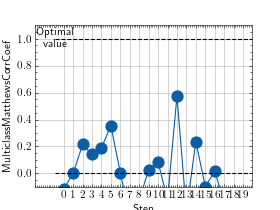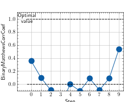 >>> from torch import rand, randint >>> # Example plotting multiple values >>> from torchmetrics.classification import BinaryMatthewsCorrCoef >>> metric = BinaryMatthewsCorrCoef() >>> values = [ ] >>> for _ in range(10): ... values.append(metric(rand(10), randint(2,(10,)))) >>> fig_, ax_ = metric.plot(values)