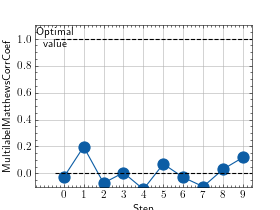 >>> from torch import rand, randint >>> # Example plotting multiple values >>> from torchmetrics.classification import MultilabelMatthewsCorrCoef >>> metric = MultilabelMatthewsCorrCoef(num_labels=3) >>> values = [ ] >>> for _ in range(10): ... values.append(metric(randint(2, (20, 3)), randint(2, (20, 3)))) >>> fig_, ax_ = metric.plot(values)