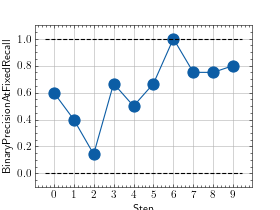 >>> from torch import rand, randint >>> # Example plotting multiple values >>> from torchmetrics.classification import BinaryPrecisionAtFixedRecall >>> metric = BinaryPrecisionAtFixedRecall(min_recall=0.5) >>> values = [ ] >>> for _ in range(10): ... # we index by 0 such that only the maximum recall value is plotted ... values.append(metric(rand(10), randint(2,(10,)))[0]) >>> fig_, ax_ = metric.plot(values)