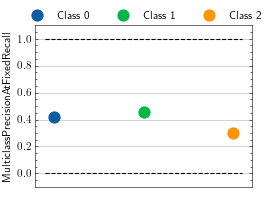 >>> from torch import rand, randint >>> # Example plotting a single value per class >>> from torchmetrics.classification import MulticlassPrecisionAtFixedRecall >>> metric = MulticlassPrecisionAtFixedRecall(num_classes=3, min_recall=0.5) >>> metric.update(rand(20, 3).softmax(dim=-1), randint(3, (20,))) >>> fig_, ax_ = metric.plot() # the returned plot only shows the maximum recall value by default