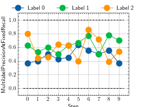>>> from torch import rand, randint >>> # Example plotting multiple values >>> from torchmetrics.classification import MultilabelPrecisionAtFixedRecall >>> metric = MultilabelPrecisionAtFixedRecall(num_labels=3, min_recall=0.5) >>> values = [ ] >>> for _ in range(10): ... # we index by 0 such that only the maximum recall value is plotted ... values.append(metric(rand(20, 3), randint(2, (20, 3)))[0]) >>> fig_, ax_ = metric.plot(values)