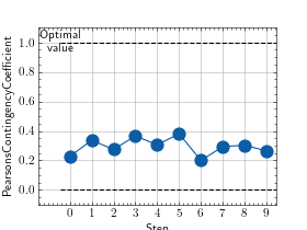 >>> # Example plotting multiple values >>> import torch >>> from torchmetrics.nominal import PearsonsContingencyCoefficient >>> metric = PearsonsContingencyCoefficient(num_classes=5) >>> values = [ ] >>> for _ in range(10): ... values.append(metric(torch.randint(0, 4, (100,)), torch.randint(0, 4, (100,)))) >>> fig_, ax_ = metric.plot(values)