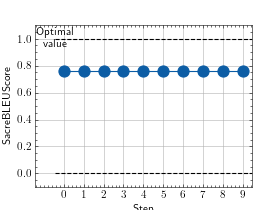 >>> # Example plotting multiple values >>> from torchmetrics.text import SacreBLEUScore >>> metric = SacreBLEUScore() >>> preds = ['the cat is on the mat'] >>> target = [['there is a cat on the mat', 'a cat is on the mat']] >>> values = [ ] >>> for _ in range(10): ... values.append(metric(preds, target)) >>> fig_, ax_ = metric.plot(values)