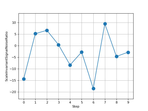 >>> # Example plotting multiple values >>> import torch >>> from torchmetrics.audio import ScaleInvariantSignalNoiseRatio >>> metric = ScaleInvariantSignalNoiseRatio() >>> values = [ ] >>> for _ in range(10): ... values.append(metric(torch.rand(4), torch.rand(4))) >>> fig_, ax_ = metric.plot(values)