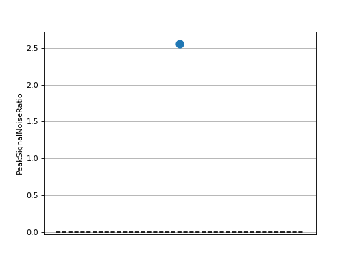 >>> # Example plotting a single value >>> import torch >>> from torchmetrics.image import PeakSignalNoiseRatio >>> metric = PeakSignalNoiseRatio() >>> preds = torch.tensor([[0.0, 1.0], [2.0, 3.0]]) >>> target = torch.tensor([[3.0, 2.0], [1.0, 0.0]]) >>> metric.update(preds, target) >>> fig_, ax_ = metric.plot()