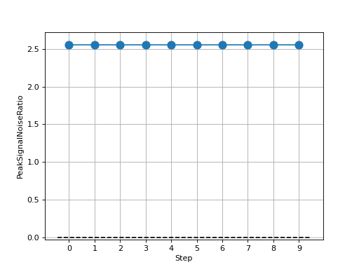 >>> # Example plotting multiple values >>> import torch >>> from torchmetrics.image import PeakSignalNoiseRatio >>> metric = PeakSignalNoiseRatio() >>> preds = torch.tensor([[0.0, 1.0], [2.0, 3.0]]) >>> target = torch.tensor([[3.0, 2.0], [1.0, 0.0]]) >>> values = [ ] >>> for _ in range(10): ... values.append(metric(preds, target)) >>> fig_, ax_ = metric.plot(values)