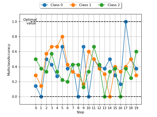 >>> from torch import randint >>> # Example plotting a multiple values per class >>> from torchmetrics.classification import MulticlassAccuracy >>> metric = MulticlassAccuracy(num_classes=3, average=None) >>> values = [] >>> for _ in range(20): ... values.append(metric(randint(3, (20,)), randint(3, (20,)))) >>> fig_, ax_ = metric.plot(values)