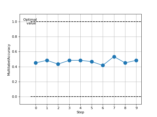 >>> from torch import rand, randint >>> # Example plotting multiple values >>> from torchmetrics.classification import MultilabelAccuracy >>> metric = MultilabelAccuracy(num_labels=3) >>> values = [ ] >>> for _ in range(10): ... values.append(metric(randint(2, (20, 3)), randint(2, (20, 3)))) >>> fig_, ax_ = metric.plot(values)