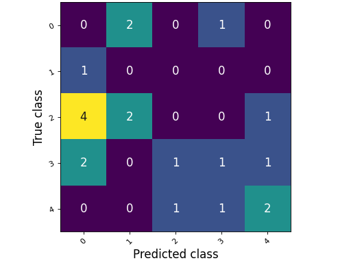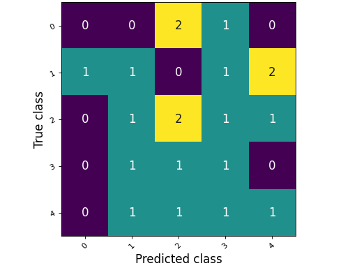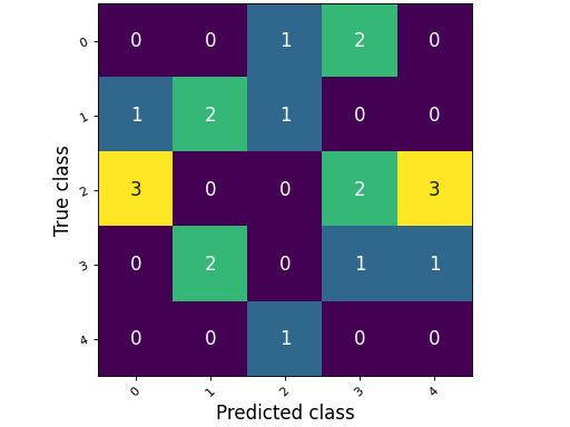 >>> from torch import randint >>> from torchmetrics.classification import MulticlassConfusionMatrix >>> metric = MulticlassConfusionMatrix(num_classes=5) >>> metric.update(randint(5, (20,)), randint(5, (20,))) >>> fig_, ax_ = metric.plot()