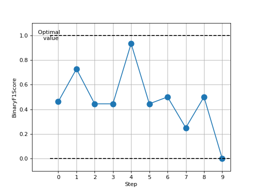 >>> from torch import rand, randint >>> # Example plotting multiple values >>> from torchmetrics.classification import BinaryF1Score >>> metric = BinaryF1Score() >>> values = [ ] >>> for _ in range(10): ... values.append(metric(rand(10), randint(2,(10,)))) >>> fig_, ax_ = metric.plot(values)
