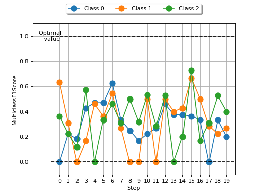 >>> from torch import randint >>> # Example plotting a multiple values per class >>> from torchmetrics.classification import MulticlassF1Score >>> metric = MulticlassF1Score(num_classes=3, average=None) >>> values = [] >>> for _ in range(20): ... values.append(metric(randint(3, (20,)), randint(3, (20,)))) >>> fig_, ax_ = metric.plot(values)