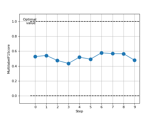 >>> from torch import rand, randint >>> # Example plotting multiple values >>> from torchmetrics.classification import MultilabelF1Score >>> metric = MultilabelF1Score(num_labels=3) >>> values = [ ] >>> for _ in range(10): ... values.append(metric(randint(2, (20, 3)), randint(2, (20, 3)))) >>> fig_, ax_ = metric.plot(values)