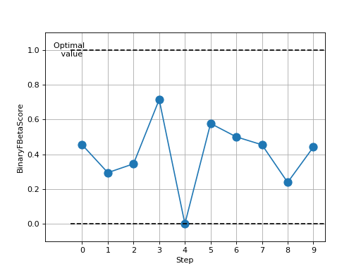 >>> from torch import rand, randint >>> # Example plotting multiple values >>> from torchmetrics.classification import BinaryFBetaScore >>> metric = BinaryFBetaScore(beta=2.0) >>> values = [ ] >>> for _ in range(10): ... values.append(metric(rand(10), randint(2,(10,)))) >>> fig_, ax_ = metric.plot(values)