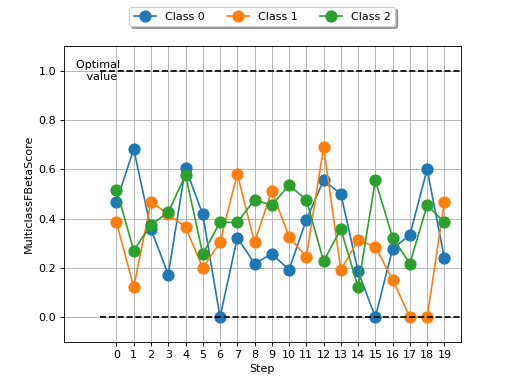 >>> from torch import randint >>> # Example plotting a multiple values per class >>> from torchmetrics.classification import MulticlassFBetaScore >>> metric = MulticlassFBetaScore(num_classes=3, beta=2.0, average=None) >>> values = [] >>> for _ in range(20): ... values.append(metric(randint(3, (20,)), randint(3, (20,)))) >>> fig_, ax_ = metric.plot(values)