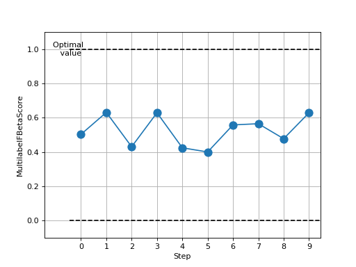 >>> from torch import rand, randint >>> # Example plotting multiple values >>> from torchmetrics.classification import MultilabelFBetaScore >>> metric = MultilabelFBetaScore(num_labels=3, beta=2.0) >>> values = [ ] >>> for _ in range(10): ... values.append(metric(randint(2, (20, 3)), randint(2, (20, 3)))) >>> fig_, ax_ = metric.plot(values)