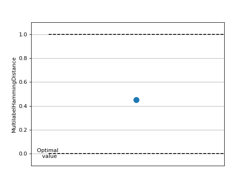 \[\text{Hamming distance} = \frac{1}{N \cdot L} \sum_i^N \sum_l^L 1(y_{il} \neq \hat{y}_{il})\]Where \(y\) is a tensor of target values, \(\hat{y}\) is a tensor of predictions, and \(\bullet_{il}\) refers to the \(l\)-th label of the \(i\)-th sample of that tensor.