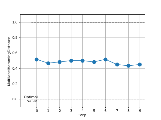 >>> # Example plotting multiple values >>> from torch import rand, randint >>> from torchmetrics.classification import MultilabelHammingDistance >>> metric = MultilabelHammingDistance(num_labels=3) >>> values = [ ] >>> for _ in range(10): ... values.append(metric(randint(2, (20, 3)), randint(2, (20, 3)))) >>> fig_, ax_ = metric.plot(values)