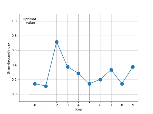 >>> # Example plotting multiple values >>> from torch import rand, randint >>> from torchmetrics.classification import BinaryJaccardIndex >>> metric = BinaryJaccardIndex() >>> values = [ ] >>> for _ in range(10): ... values.append(metric(rand(10), randint(2,(10,)))) >>> fig_, ax_ = metric.plot(values)