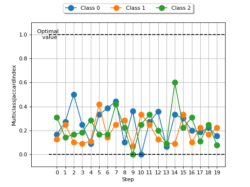 >>> # Example plotting a multiple values per class >>> from torch import randint >>> from torchmetrics.classification import MulticlassJaccardIndex >>> metric = MulticlassJaccardIndex(num_classes=3, average=None) >>> values = [] >>> for _ in range(20): ... values.append(metric(randint(3, (20,)), randint(3, (20,)))) >>> fig_, ax_ = metric.plot(values)
