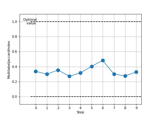 >>> # Example plotting multiple values >>> from torch import rand, randint >>> from torchmetrics.classification import MultilabelJaccardIndex >>> metric = MultilabelJaccardIndex(num_labels=3) >>> values = [ ] >>> for _ in range(10): ... values.append(metric(randint(2, (20, 3)), randint(2, (20, 3)))) >>> fig_, ax_ = metric.plot(values)