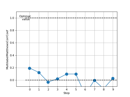 >>> from torch import rand, randint >>> # Example plotting multiple values >>> from torchmetrics.classification import MultilabelMatthewsCorrCoef >>> metric = MultilabelMatthewsCorrCoef(num_labels=3) >>> values = [ ] >>> for _ in range(10): ... values.append(metric(randint(2, (20, 3)), randint(2, (20, 3)))) >>> fig_, ax_ = metric.plot(values)