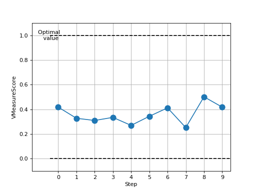 >>> # Example plotting multiple values >>> import torch >>> from torchmetrics.clustering import VMeasureScore >>> metric = VMeasureScore() >>> values = [ ] >>> for _ in range(10): ... values.append(metric(torch.randint(0, 4, (10,)), torch.randint(0, 4, (10,)))) >>> fig_, ax_ = metric.plot(values)