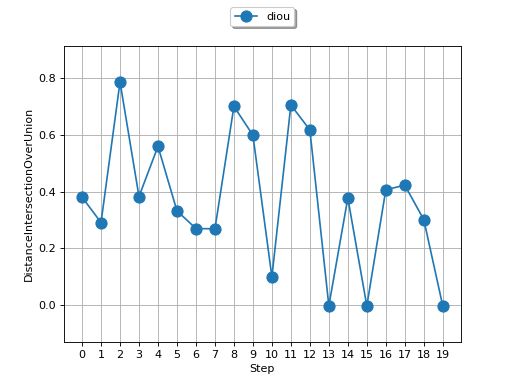 >>> # Example plotting multiple values >>> import torch >>> from torchmetrics.detection import DistanceIntersectionOverUnion >>> preds = [ ... { ... "boxes": torch.tensor([[296.55, 93.96, 314.97, 152.79], [298.55, 98.96, 314.97, 151.79]]), ... "scores": torch.tensor([0.236, 0.56]), ... "labels": torch.tensor([4, 5]), ... } ... ] >>> target = lambda : [ ... { ... "boxes": torch.tensor([[300.00, 100.00, 315.00, 150.00]]) + torch.randint(-10, 10, (1, 4)), ... "labels": torch.tensor([5]), ... } ... ] >>> metric = DistanceIntersectionOverUnion() >>> vals = [] >>> for _ in range(20): ... vals.append(metric(preds, target())) >>> fig_, ax_ = metric.plot(vals)