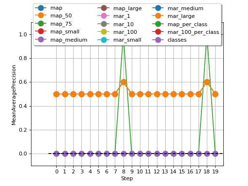 >>> # Example plotting multiple values >>> import torch >>> from torchmetrics.detection.mean_ap import MeanAveragePrecision >>> preds = lambda: [dict( ... boxes=torch.tensor([[258.0, 41.0, 606.0, 285.0]]) + torch.randint(10, (1,4)), ... scores=torch.tensor([0.536]) + 0.1*torch.rand(1), ... labels=torch.tensor([0]), ... )] >>> target = [dict( ... boxes=torch.tensor([[214.0, 41.0, 562.0, 285.0]]), ... labels=torch.tensor([0]), ... )] >>> metric = MeanAveragePrecision() >>> vals = [] >>> for _ in range(20): ... vals.append(metric(preds(), target)) >>> fig_, ax_ = metric.plot(vals)